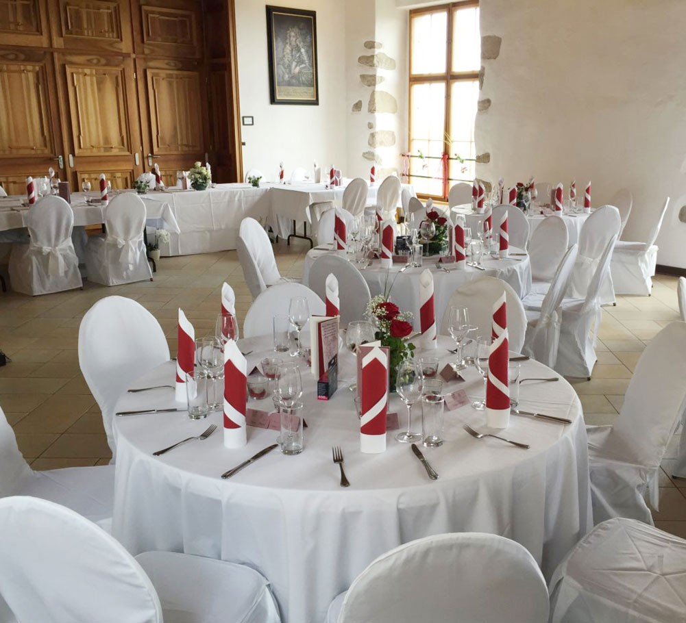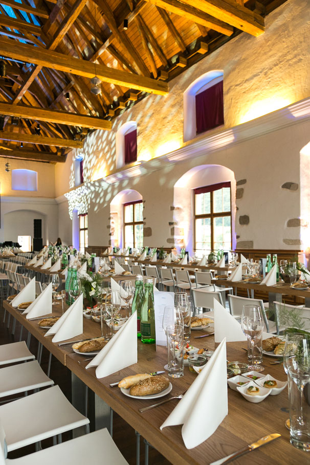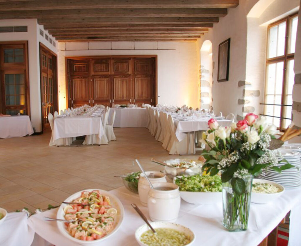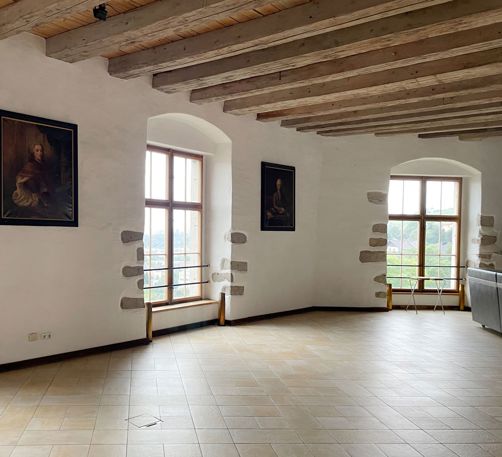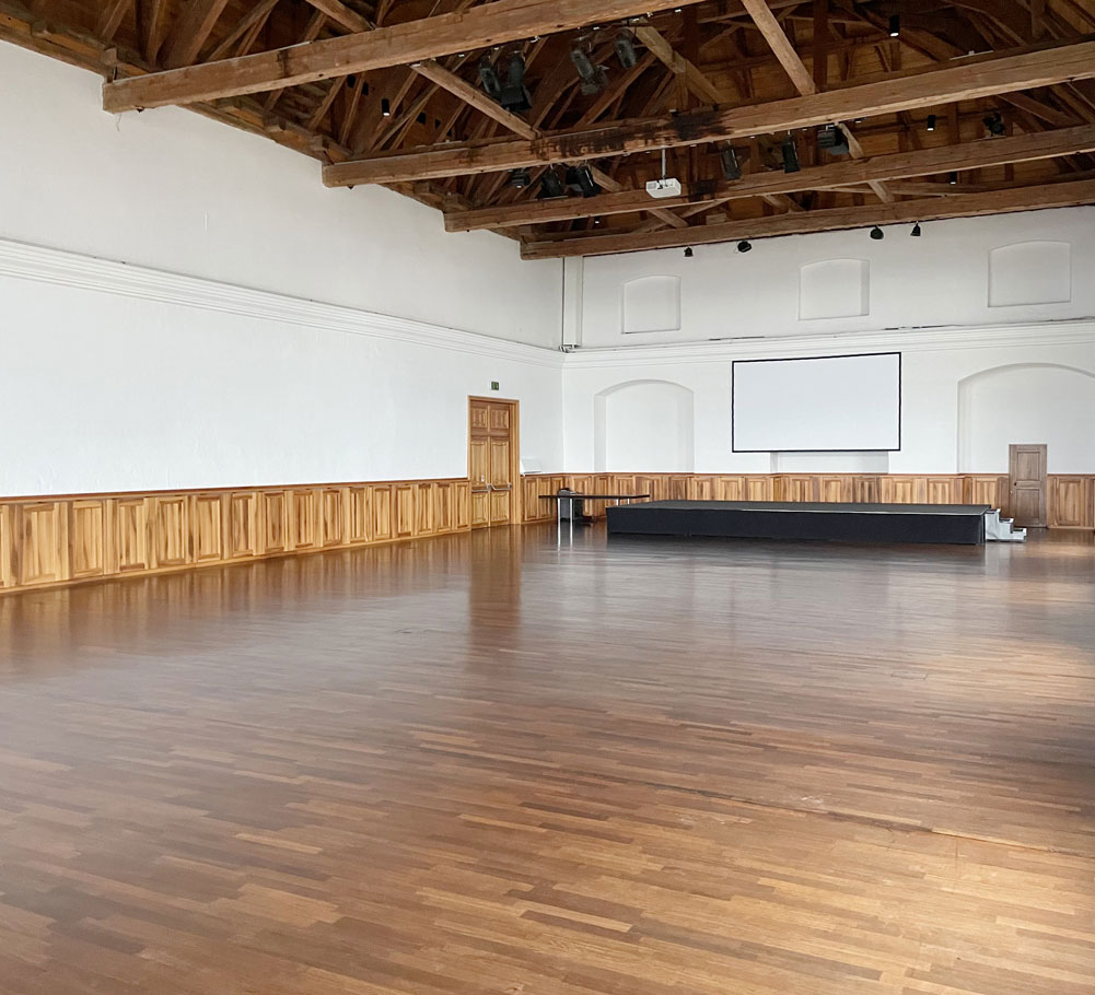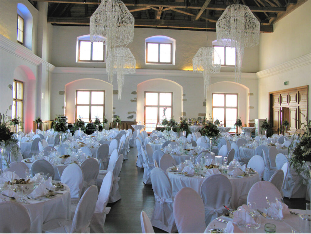 Mit rund 385 m² ist der Rittersaal der größte historische Saal eines Schlosses in Oberösterreich und bietet Raum für bis zu 450 Gäste. Imposant ist sein offenes Dach mit sichtbarem Gebälk, das eine majestätische und zugleich authentisch historische Atmosphäre schafft. Moderne Technik macht den Saal vielseitig nutzbar: Licht- und Tontechnik, Beamer, Leinwand und eine variable Bühne ermöglichen ein breites Spektrum an Veranstaltungen – von eleganten Hochzeiten über Konzerte bis zu Business-Events und Kongressen.